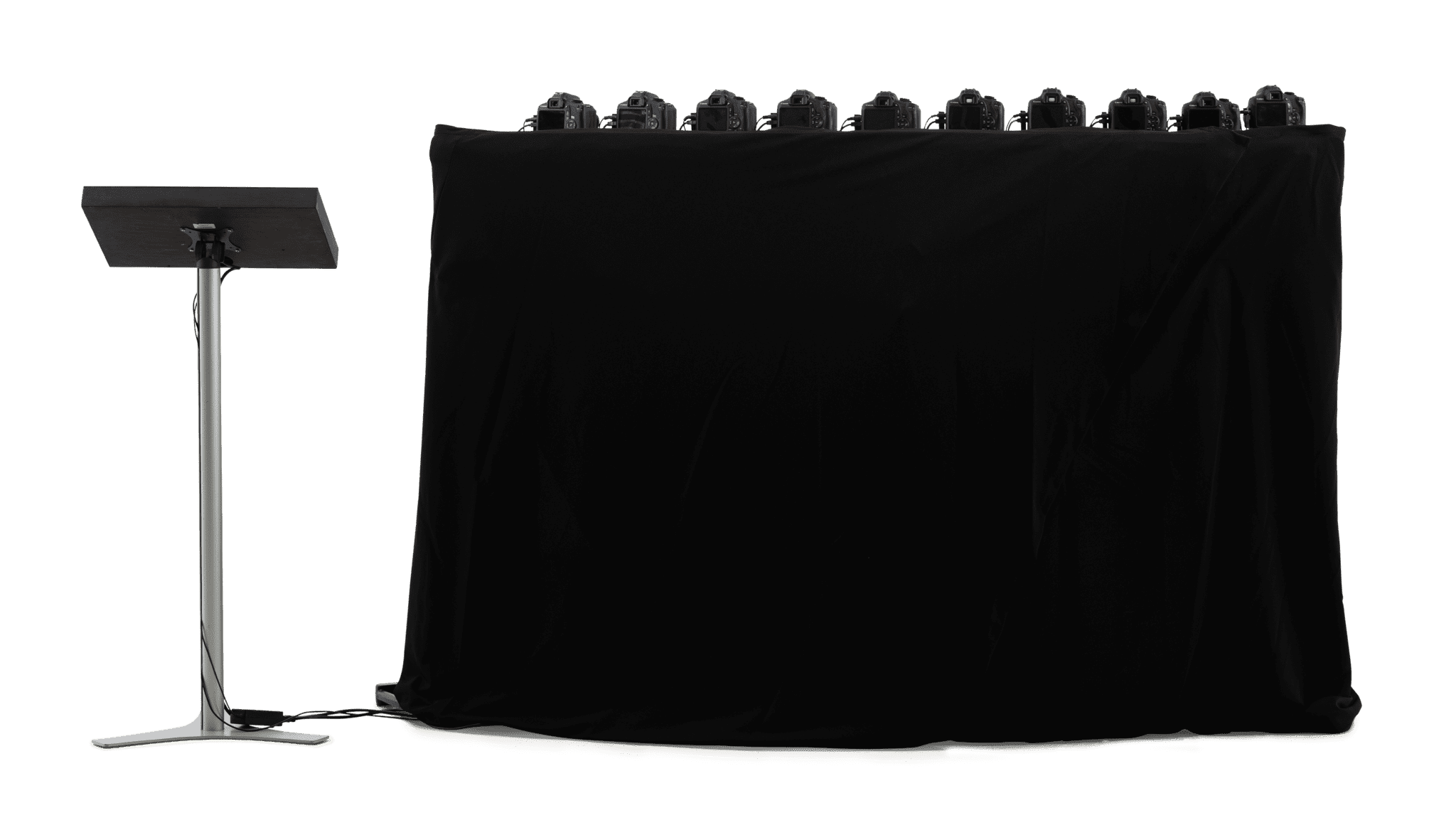 freezzFRAME ist derzeit unser aufwendigstes System: Eine Reihe von Spiegelreflexkameras, die auf einem bogenförmigen Gestell montiert sind, wird gleichzeitig ausgelöst. Diese aus leicht unterschiedlichen Perspektiven aufgenommenen Fotos ermöglichen es, einen kurzen Clip mit einem verblüffenden Effekt zu erstellen: Wie im Film „Matrix“ hat man den Eindruck, dass die Kamera sich um eine in der Bewegung erstarrte Person herumbewegt. Die kleine Variante des freezzFRAME besteht aus zehn Kameras, die in einem 45-Grad-Winkel angeordnet sind, und kann eine einzelne oder zwei eng beieinander stehende Personen aufnehmen.